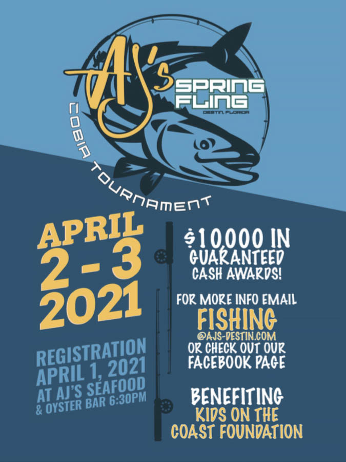 For more information, email: fishing@ajs-destin.com; call: 850-837-0404; or follow their Facebook event page: https://www.facebook.com/AJs-Spring-Fling-Cobia-Tournament-1355341257859169