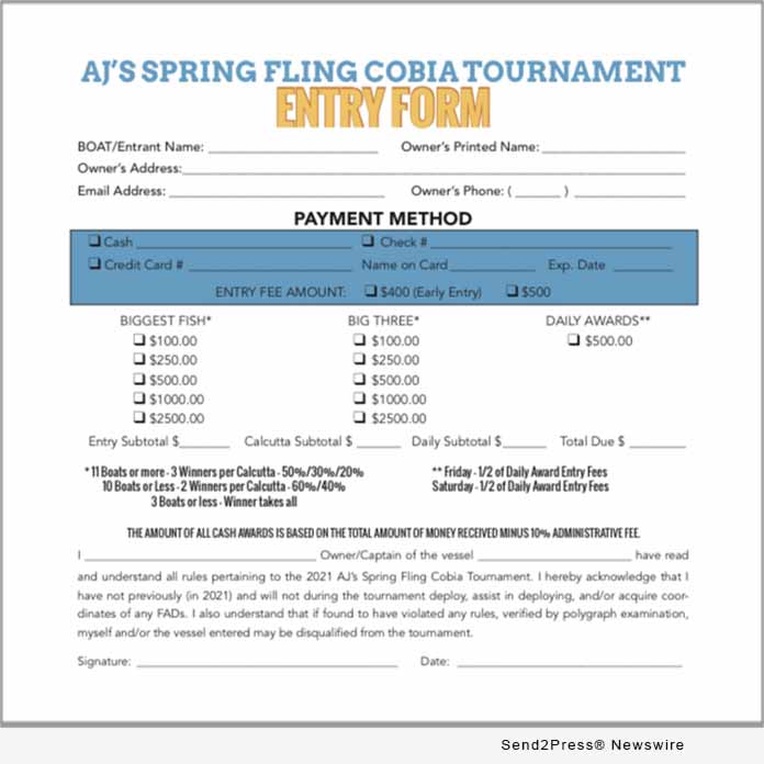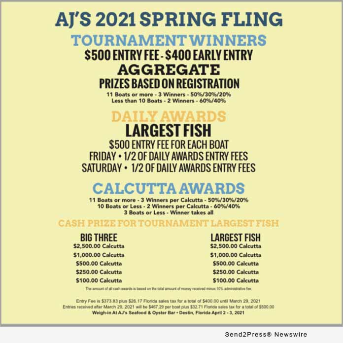DESTIN, Fla., March 8, 2021 (SEND2PRESS NEWSWIRE) — It’s time to break out that fishing gear. AJ’s Seafood and Oyster Bar is hosting its Spring Fling Cobia Tournament from April 2-3, 2021. And, this year’s event benefits two of its favorite non-profits, the Destin Fishing Museum and Kids on the Coast Foundation. Proceeds from the tournament will be split between the two.