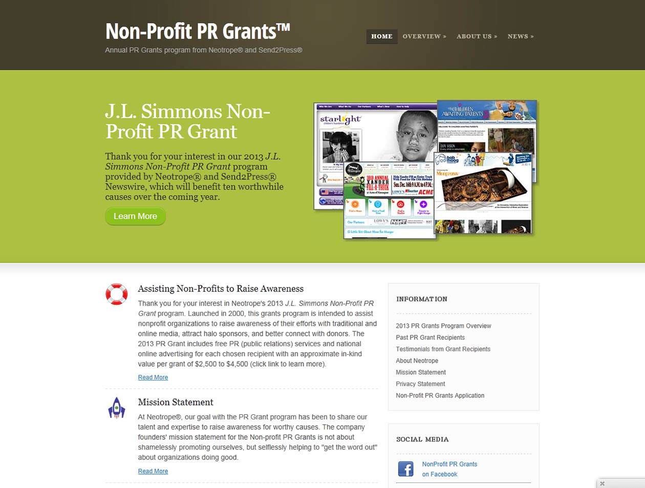 Additional information regarding the Neotrope 2014 J.L. Simmons Non-Profit PR Grant program for U.S. charitable non-profits and grant recipients can be found at: https://www.send2press.com/non-profit/ or http://prgrants.com/ or on Facebook at https://facebook.com/NonProfitPRGrant.
