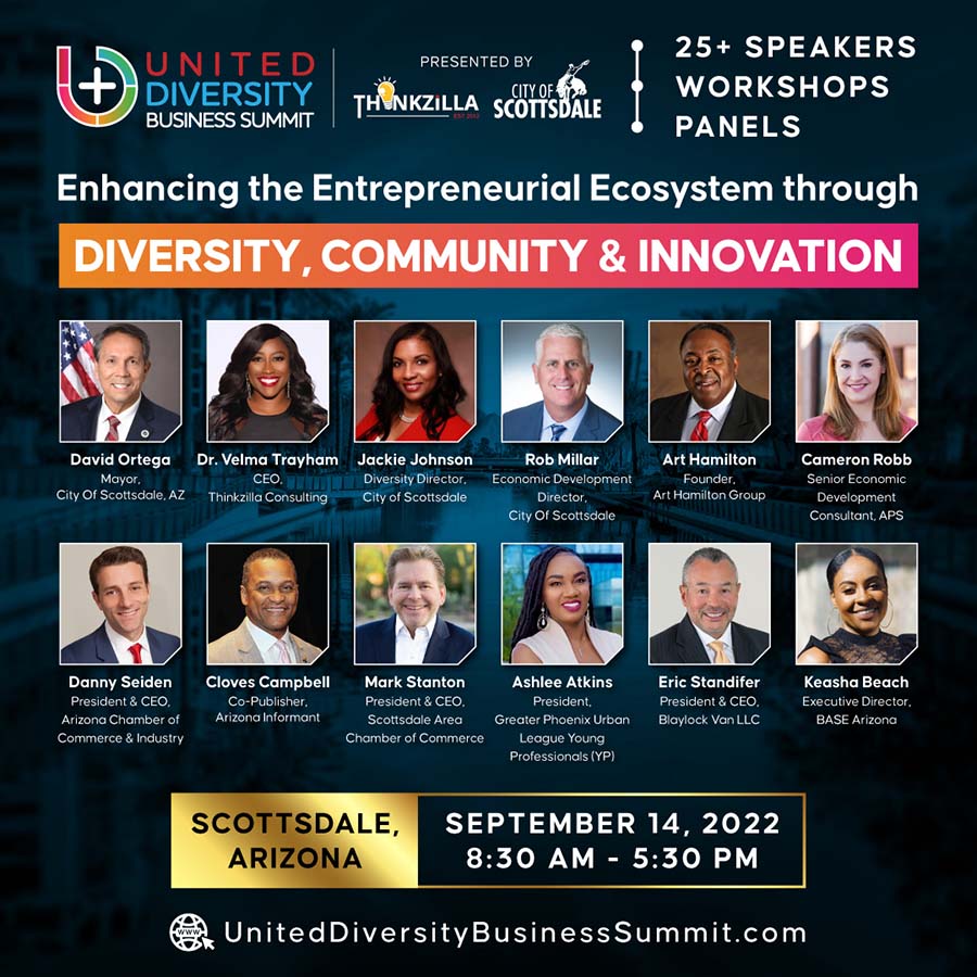 The 2022 United Diversity Business Summit will be held from 8:30 a.m. to 5:30 p.m. at the Scottsdale Center for the Performing Arts Center with the theme of “Enhancing the Entrepreneurial Ecosystem through Diversity, Community and Innovation.” It is free for attendees.