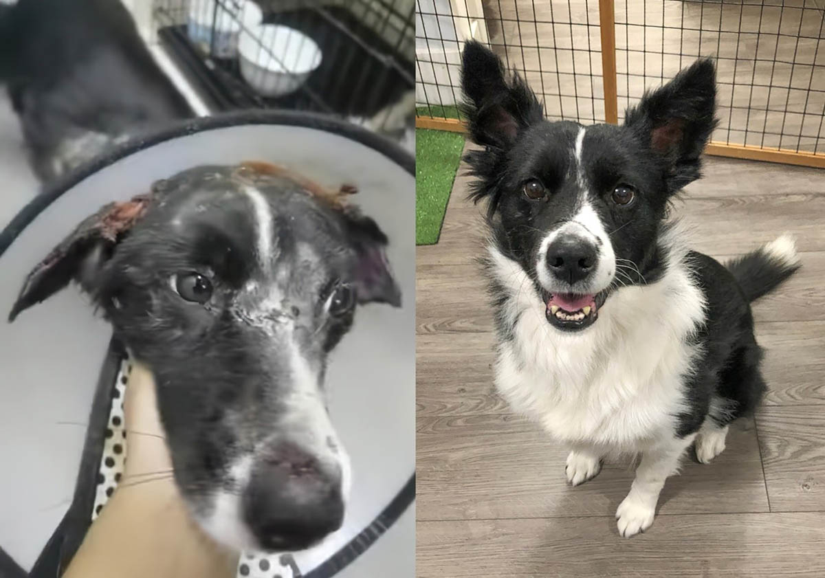 *Caption: Before and after pictures of Emlyn. On the left, after she was found by our rescuer in China suffering from acid burns over a large part of her body. On the right, a recent picture of how spoiled, loved, and happy she is in her new forever home in Canada.