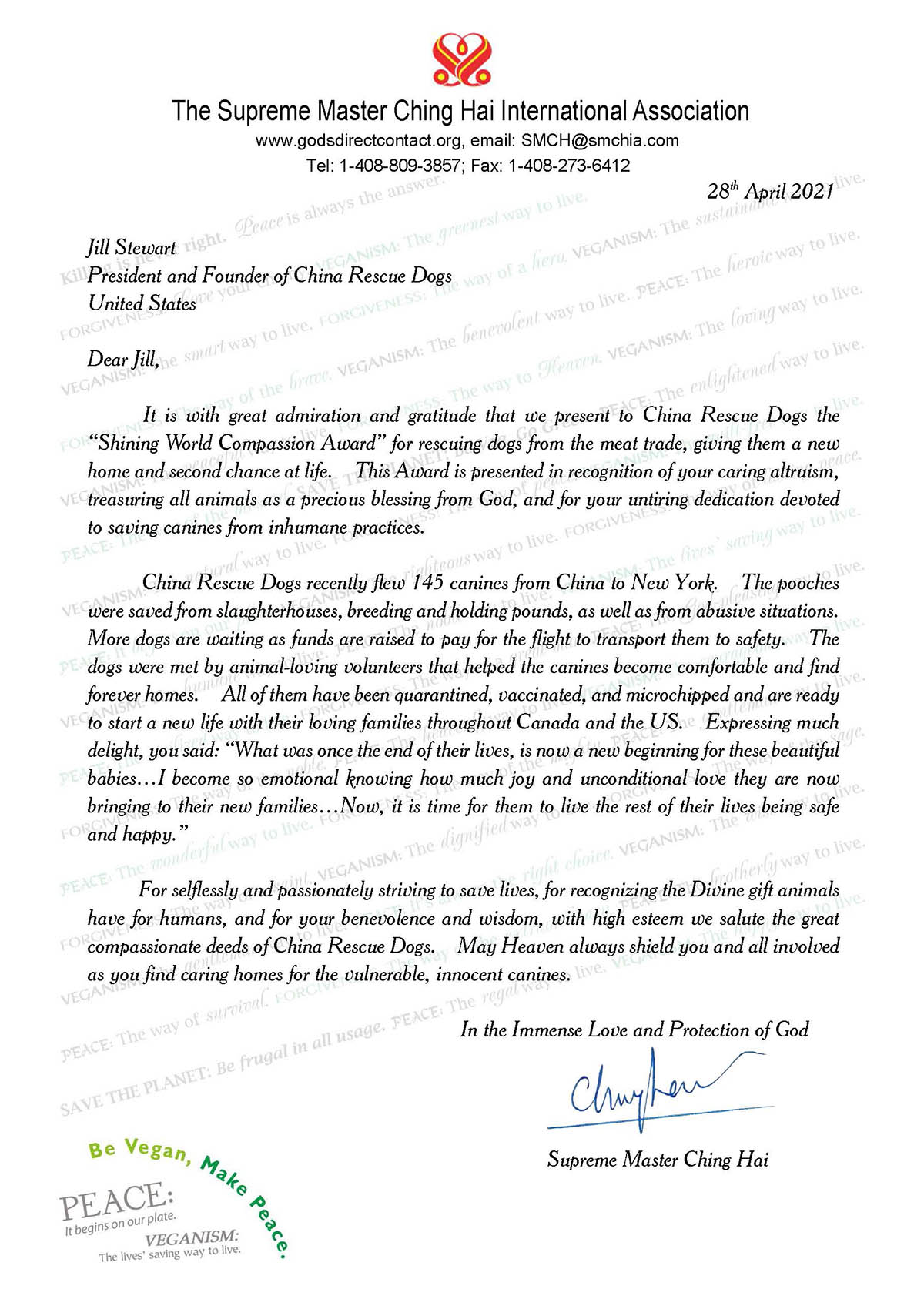 VASS, N.C., May 5, 2021 (SEND2PRESS NEWSWIRE) — China Rescue Dogs, a 501(c)(3) organization committed to rescuing and saving dogs from the slaughterhouses, meat trade, abuse, and neglect in China, is the recipient of the “Shining World Compassion Award” by The Supreme Master Ching Hai International Association based out of Taiwan.