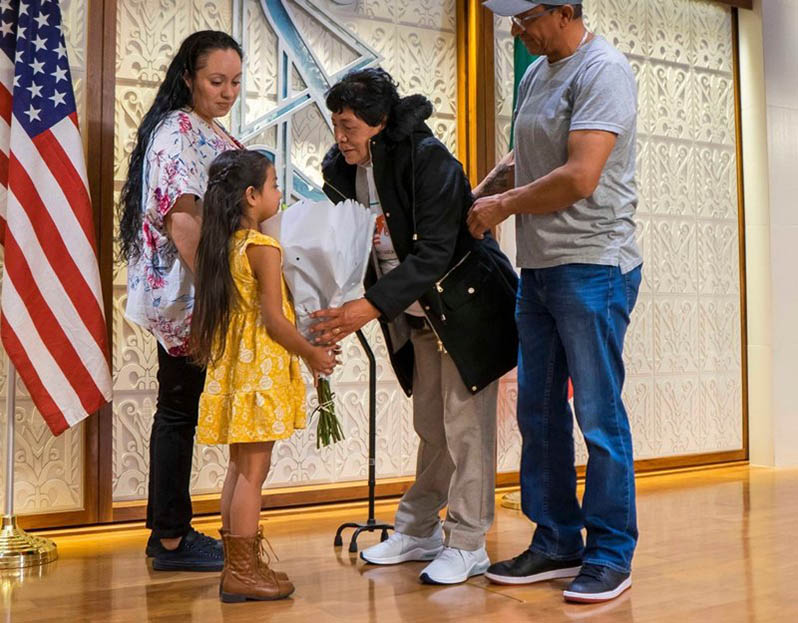 Photo Caption: A young girl brings flowers for the grandmother she is meeting for the first time. The reunion was organized by Tlaxcaltecas USA and hosted by the Church of Scientology Los Angeles.