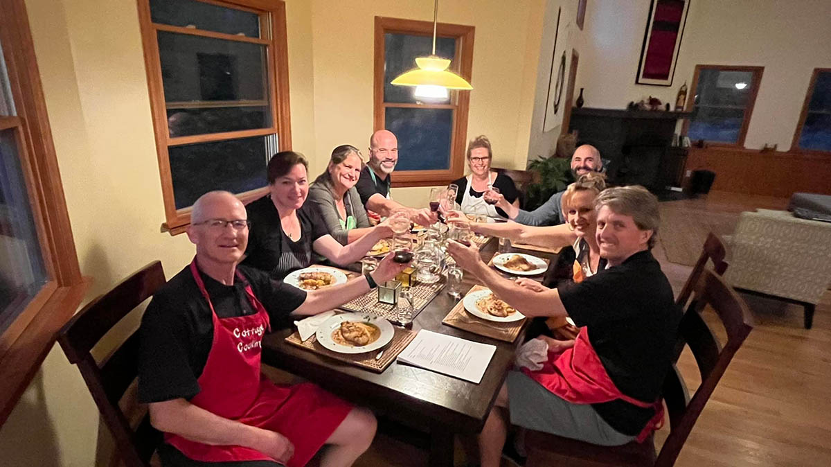 Photo Caption: Friends reunite at offsite vacation rental for a cooking class. Cheers!