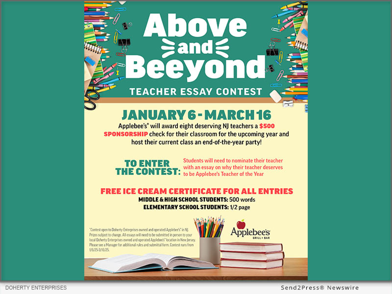 ALLENDALE, N.J., Jan. 15, 2025 (SEND2PRESS NEWSWIRE) — Doherty Enterprises-owned Applebee’s® Neighborhood Grill & Bar locations in New Jersey are excited to announce the start of their 9th annual “Above and ‘BEE’yond Teacher Essay Contest.”