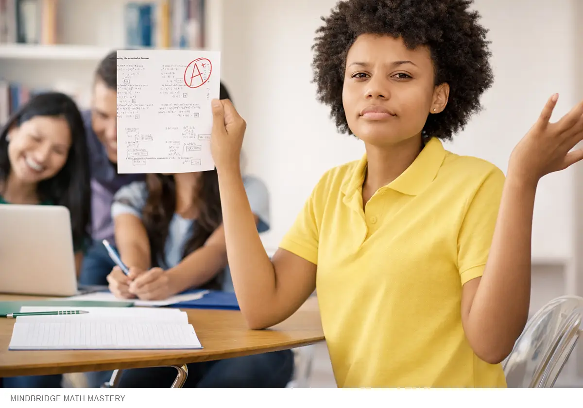Image caption: A student holds a graded math assignment, illustrating how strong grades can mask underlying gaps in conceptual understanding.