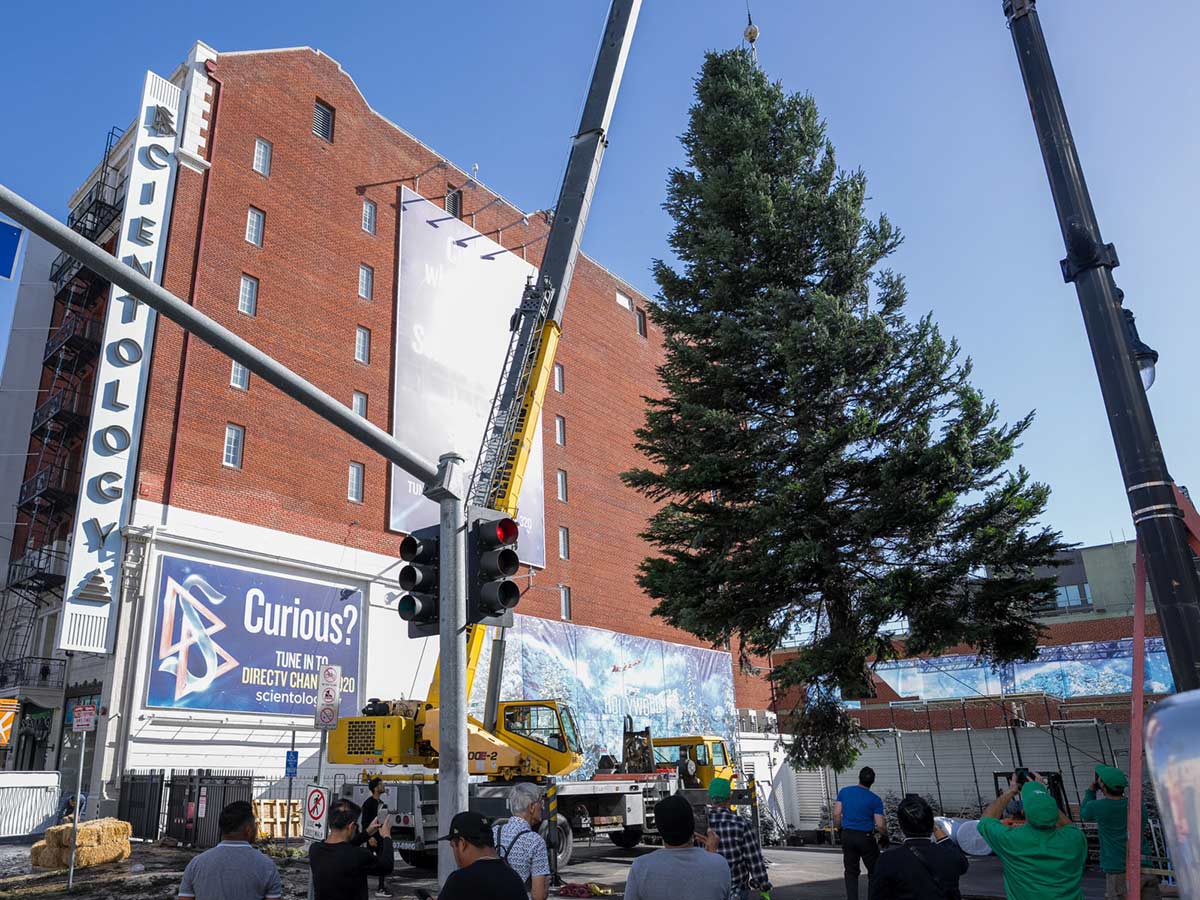 Photo Caption: Carefully craning the tree into place next to the Church of Scientology Los Angeles Information Center on Hollywood Boulevard, where it will reign over the holiday festivities at L. Ron Hubbard’s Winter Wonderland throughout December.