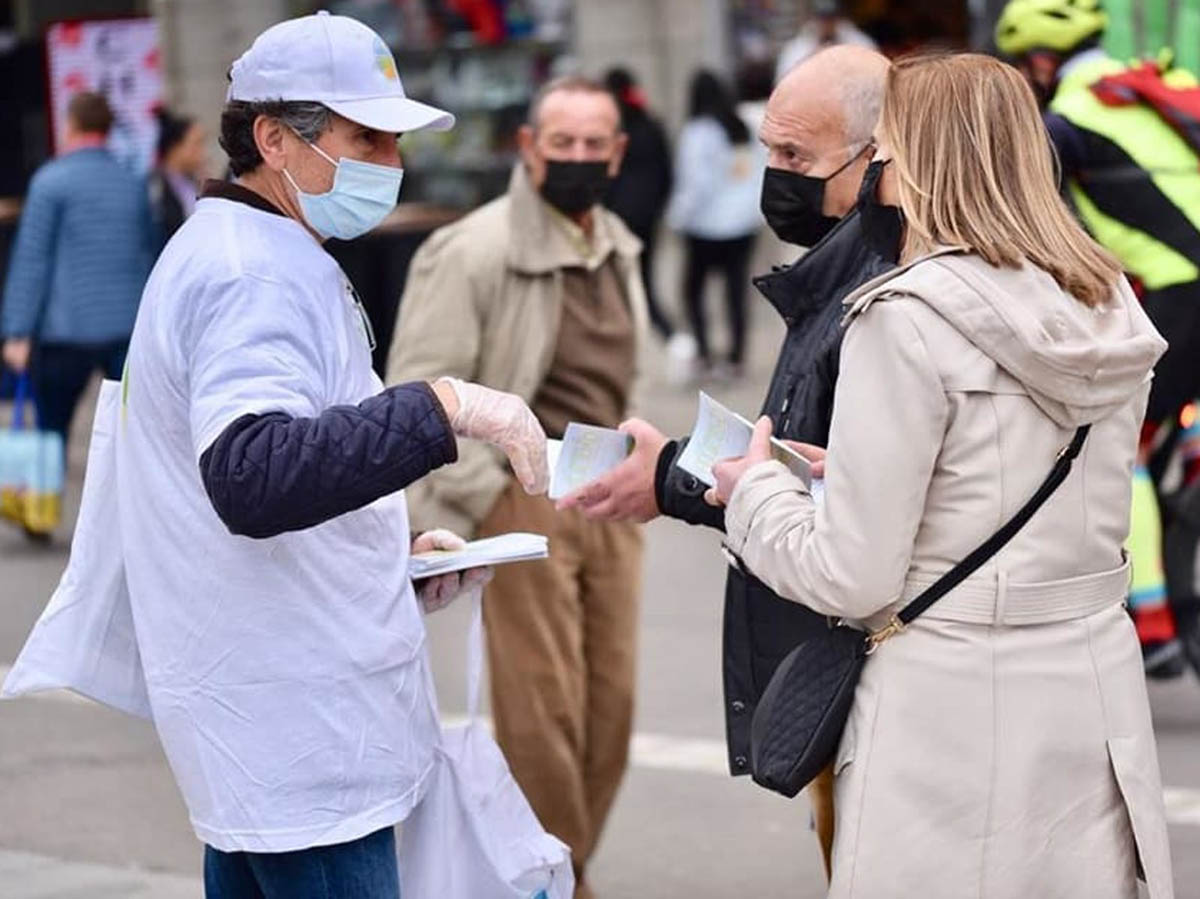Caption: Volunteers in Spain share The Way to Happiness to help others improve the quality of their lives.