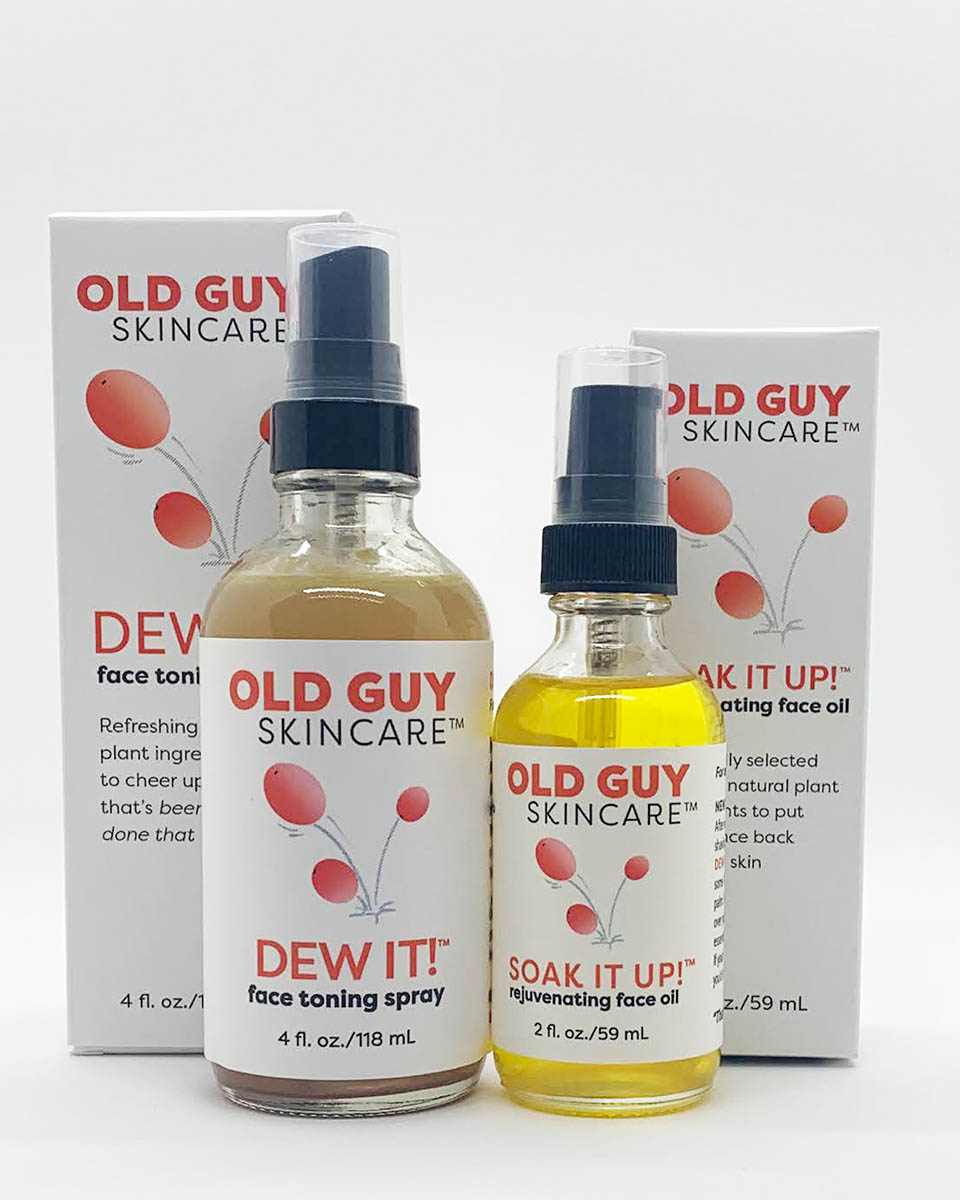 *Caption: Old Guy Skincare all-natural skincare products: Dew It! face toning spray and Soak It Up! face oil serum.