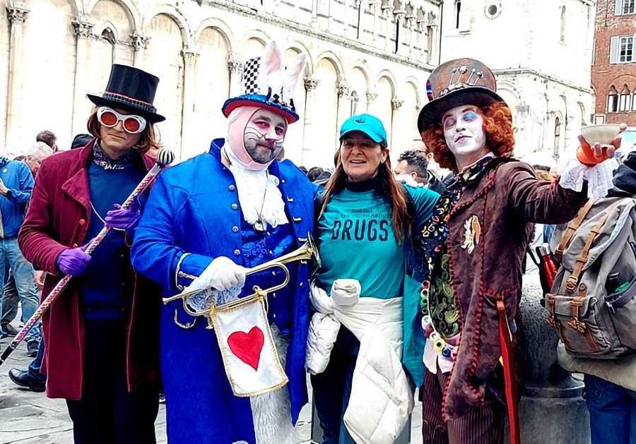 Photo Caption: “You’d have to be Mad as a Hatter to experiment with drugs without informing yourself about them and the harm they can cause,” say the Drug-Free World Italy volunteers.