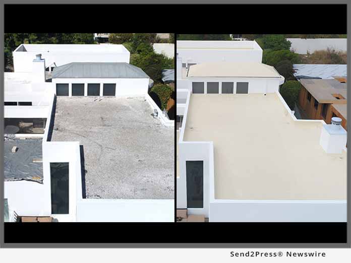 DANA POINT, Calif., June 14, 2018 (SEND2PRESS NEWSWIRE) — Repairing chronic roof leaks due to poor home construction without doing a tear-off or further construction takes innovation, ingenuity, skill, and in this case, the right product line up, says Pacific Roofing Systems. Pacific met the “construction-less” challenge to repair 2,000 square feet of spudded rock flat roofing and sloped metal roofing on a private Laguna Beach residence by instead proposing the use of a unique formulated monolithic liquid single-ply waterproof roof system known as the SureCoat Roof System.
