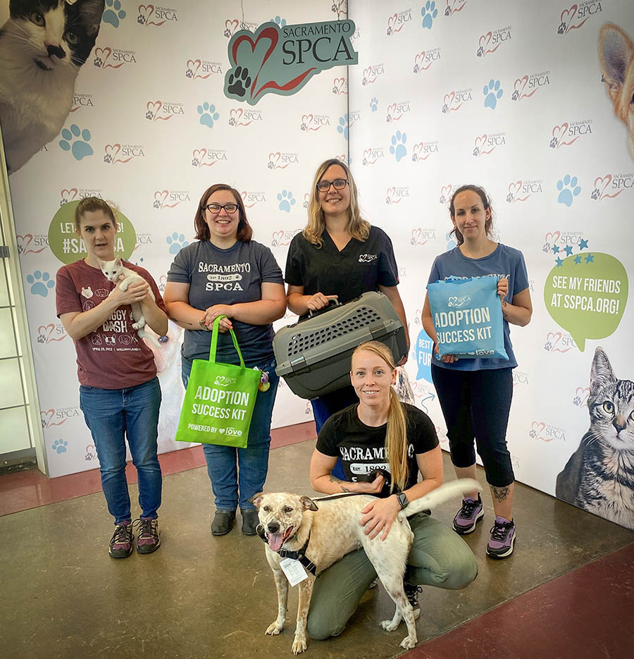Image caption: Photo Caption: Staff from the Sacramento SPCA gather with pets and the Adoption Success Kits they will take home in the shelter’s Adoption Center.