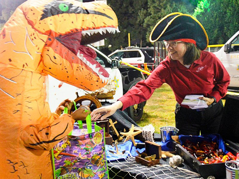 Photo Caption: Bridge volunteer places sweets and “The Way to Happiness” in the trick-or-treat bag of a friendly dragon at the East L.A. Sheriff’s Department Halloween celebration.