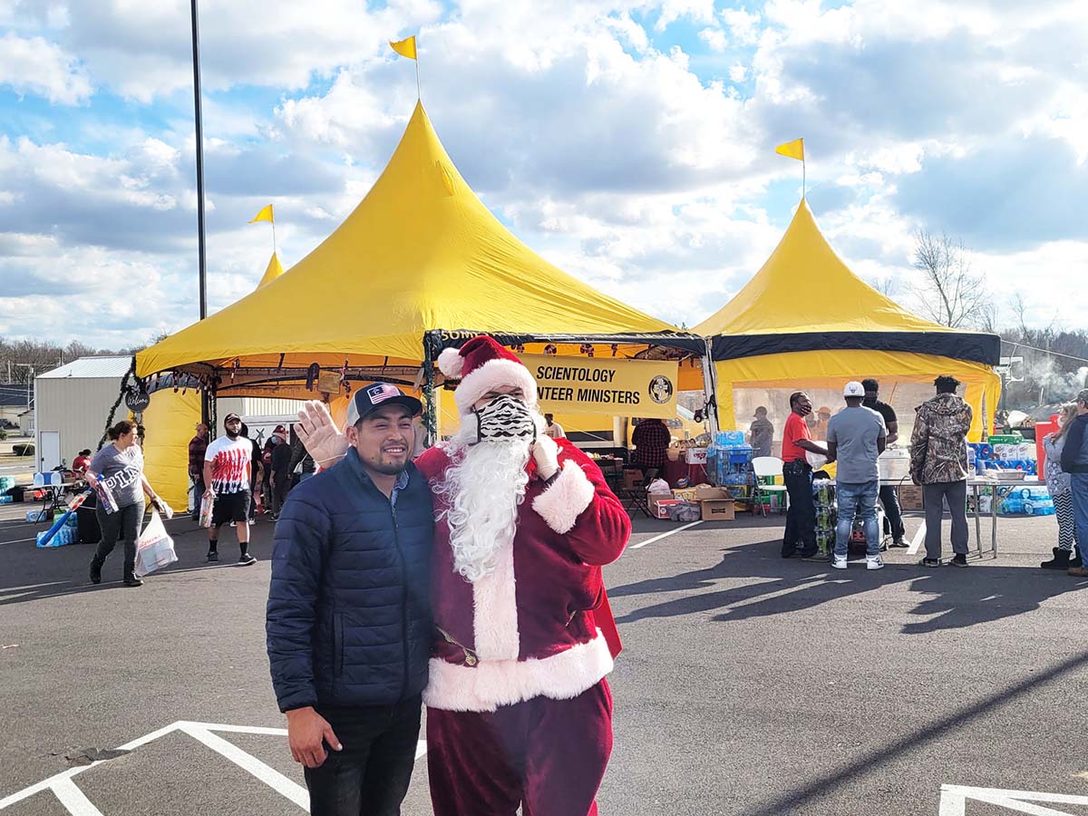 MAYFIELD, Ky., Dec. 28, 2021 (SEND2PRESS NEWSWIRE) — Scientology Volunteer Ministers came from across the country to help a town destroyed by the 10 December tornado celebrate the holiday. “Thank you for bringing some happiness,” an elderly couple called out to a Volunteer Minister as they walked up to the bright yellow tent in Mayfield, Kentucky, on Christmas Day.