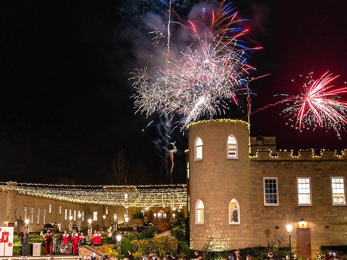 Caption: Fireworks over Saint Hill Castle as the annual lighting ceremony at Saint Hill, UK Scientology headquarters, signals the start of the holiday season.