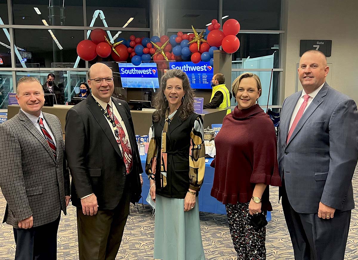 Photo caption: Southwest Airlines debuted its new daily Amarillo/Austin flight Thursday morning at Rick Husband Amarillo International Airport. In attendance were (left to right): Amarillo Chamber of Commerce President and CEO Jason Harrison; Director of Aviation at Rick Husband Amarillo International Airport Michael Conner; Amarillo Mayor Ginger Nelson; Amarillo Convention and Visitor Bureau Executive Director Kashion Smith and Amarillo Economic Development Corp. President and CEO Kevin Carter.