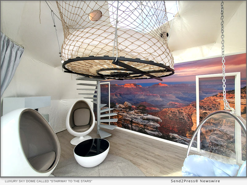 Photo Caption: 2-person Luxury Sky Dome called “Stairway to the Stars” features spiral staircase leading to a bed suspended beneath the skylight.