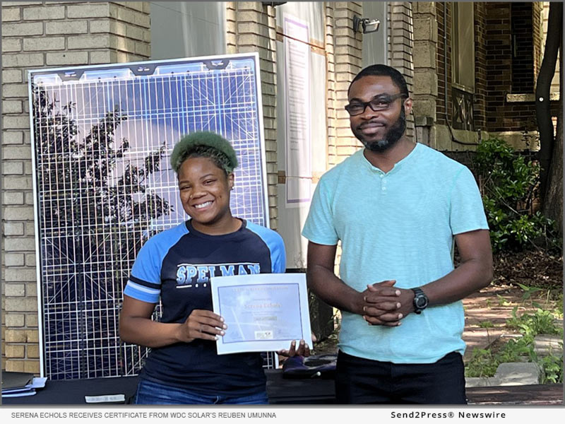 PHOTO CAPTION: Serena Echols receives a certificate from WDC Solar’s Reuben Umunna after completing solar installation training during HBCU Green Fund’s AUC Fellows Program.