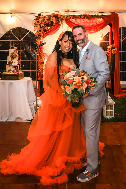Photo caption: Natalie Ramos (now Natalie Vaughn) in her very orange dress and new husband Michael Vaughn.
