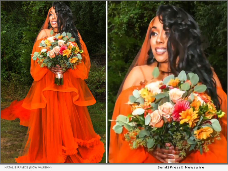 PHOTO CAPTION: Photo caption: Natalie Ramos (now Natalie Vaughn) in her very orange dress and new husband Michael Vaughn.