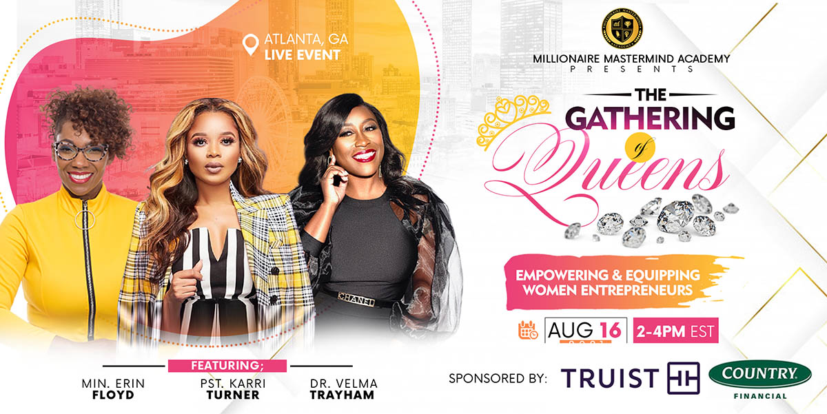 Registration for the women-only event, to be hosted Aug. 16, 2021 from 2-4 p.m. Eastern at Newbirth Missionary Baptist Church in Stonecrest, Georgia, is now open. With a theme of “The Gathering of the Queens: Empowering and Equipping Women Entrepreneurs,” the special event features program founder and award-winning entrepreneur Dr. Velma Trayham, author and business leader Pastor Karri Turner, and Vice President and Area Lead of Truist Bank, Erin Floyd.
