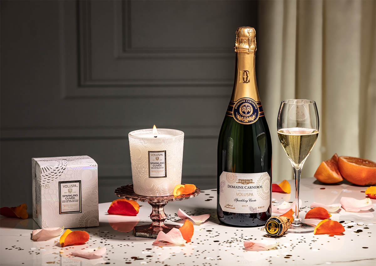 The limited-edition gift set features one 750 ml bottle of a custom-labeled Domaine Carneros sparkling wine paired with a Voluspa Sparkling Cuvée 9oz. Classic Candle. This set makes the perfect luxurious gift for any celebration. Sparking Cuvée’s packaging is designed around the iridescent sheen of sparkling wine bubbles. A perfect complement to an evening of self-care or a gathering of friends, the opalescent Japonica glass accentuates the energy in the room with its sparkle and shine.
