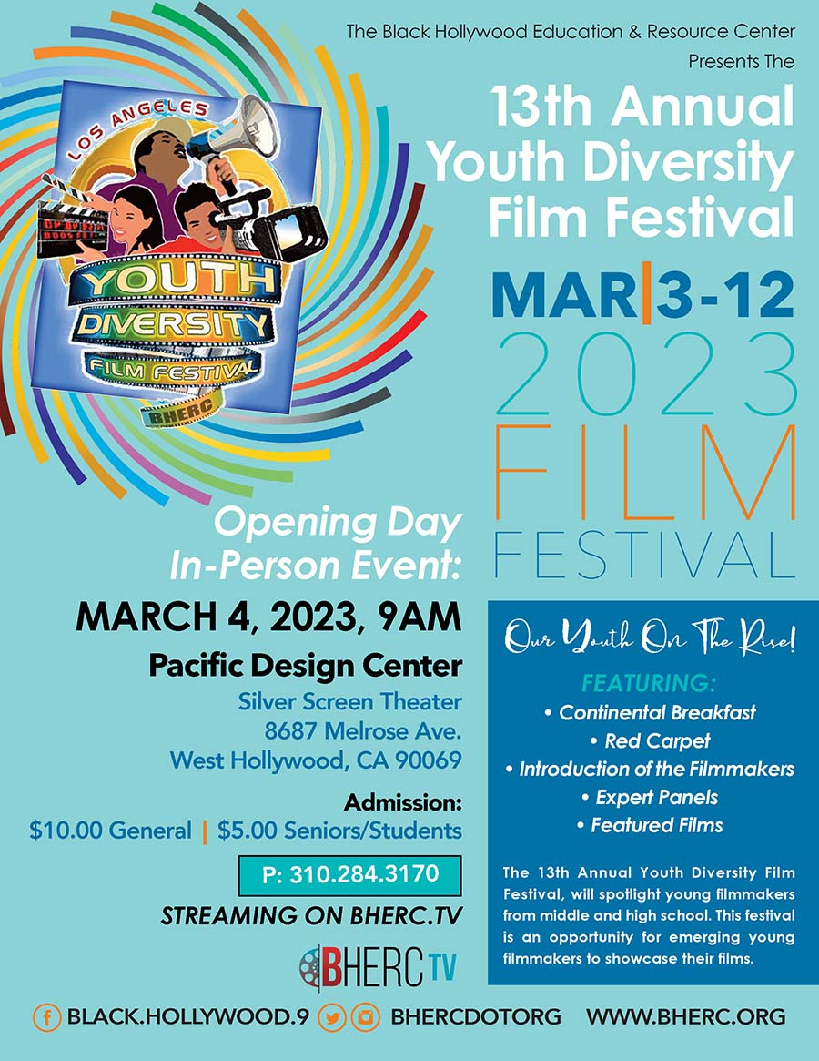 HOLLYWOOD, Calif., March 1, 2023 (SEND2PRESS NEWSWIRE) — The Black Hollywood Education and Resource Center (BHERC) announces the 13th Annual Youth Diversity Film Festival (YDFF) Friday, March 3 through Sunday, March 12, 2023. On Saturday March 4 an in-person opening day will take place at the Pacific Design Center’s Silver Screen Theater, from 9:30 a.m. – 3:30 p.m. (8687 Melrose Avenue, West Hollywood, CA 90069), as well as online at BHERC.TV.